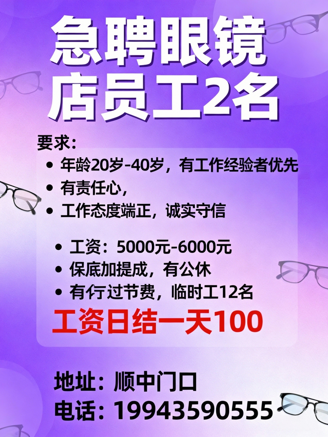 急聘 眼镜店员工2名:年龄20岁-40岁有工作经验者优先,有责任心,工作态度...