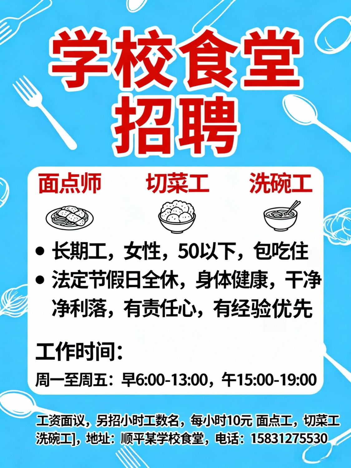 学校食堂招聘面点师,切菜工,洗碗工要求:长期工,女性,50以下,包吃住,法定节假日全休身体健康,干净利落,有责任心,有经验者优先工作时间:周一早上7点一12:30,下午14-下午18点周二,三,四早上4点一中午12:30下午14点一下午18点周五早上4点一中午12:30工资面议另招小时工数名每小时10元[面点工,切菜工,洗碗工]地址:顺平某学校食堂电话:*****5530
