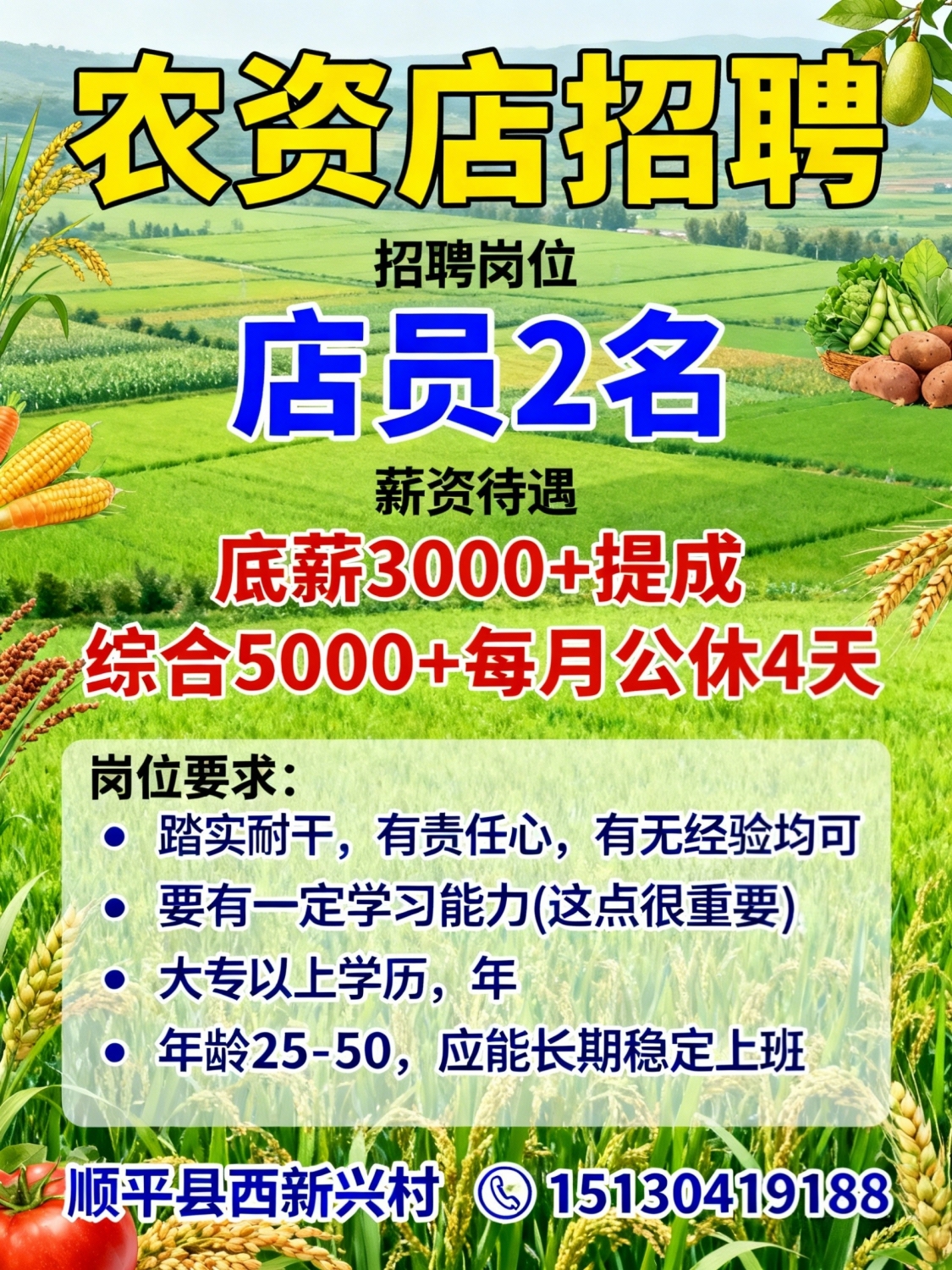 农资店招聘店员2名薪资待遇底薪3000+提成,综合5000+每月公休4天岗位要求踏实耐干,有责任心有无经验均可,要有一定学习能力(这点很重要)大专以上学历,年龄25-50,能长期稳定上班地点:顺平县西新兴村联系:*****9188