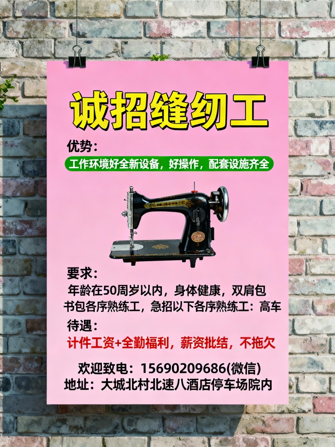 诚招缝纫工; 我厂常年招聘熟练缝纫工,工作环境好,全新设备,好操作,配...
