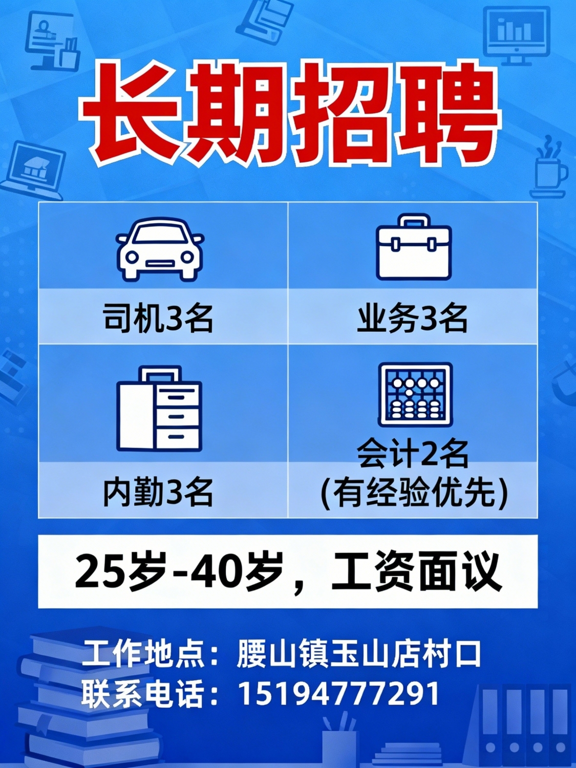 长期招聘司机3名,业务3名内勤3名,会计2名(有经验优先)25岁40岁,工资面议工作地点:腰山镇玉山店村口联系电话:*****7291