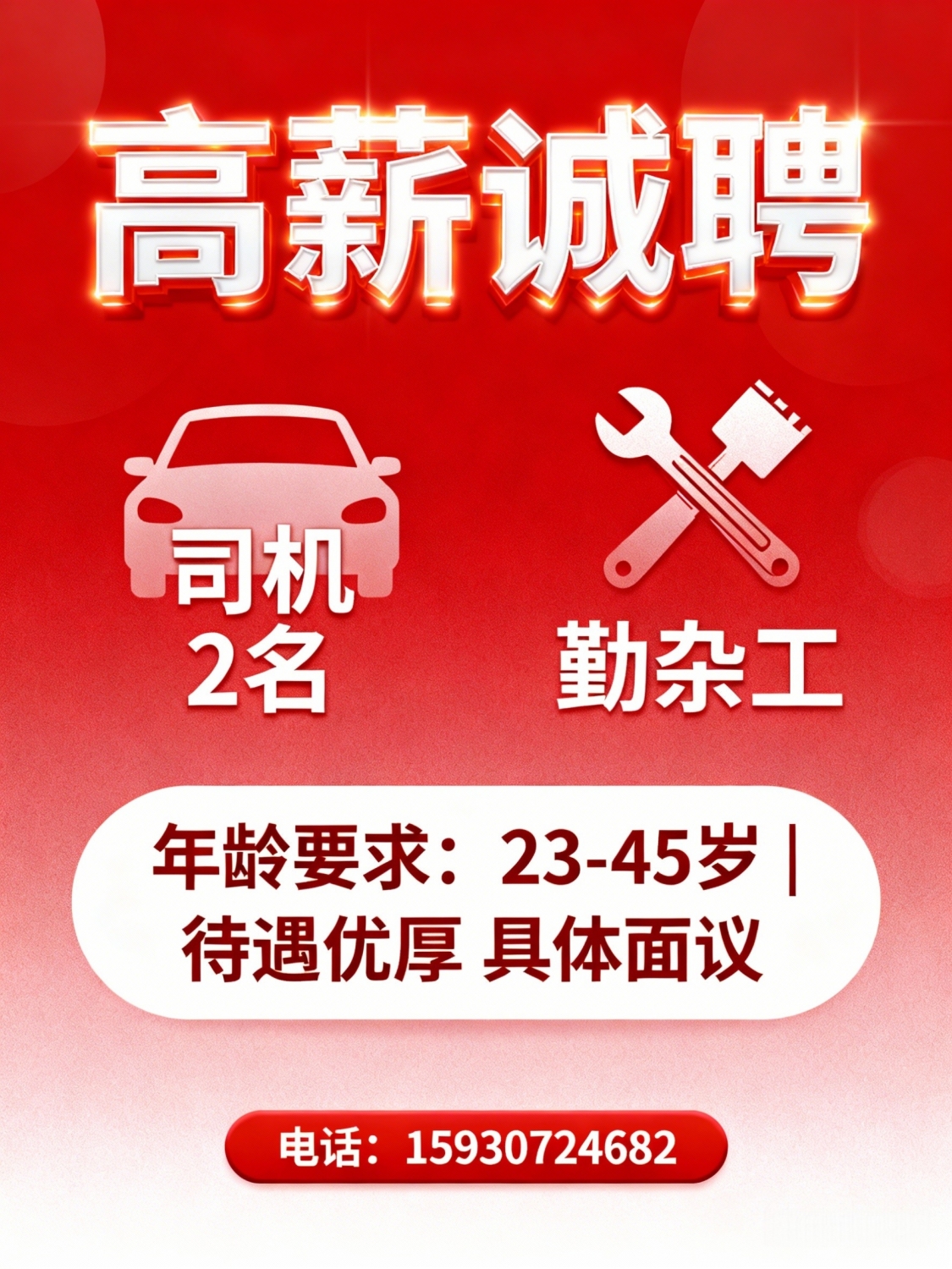 詔聘司机2,勤杂工23-50岁,待遇优厚具体面议要求年龄23到45岁电话:159307...