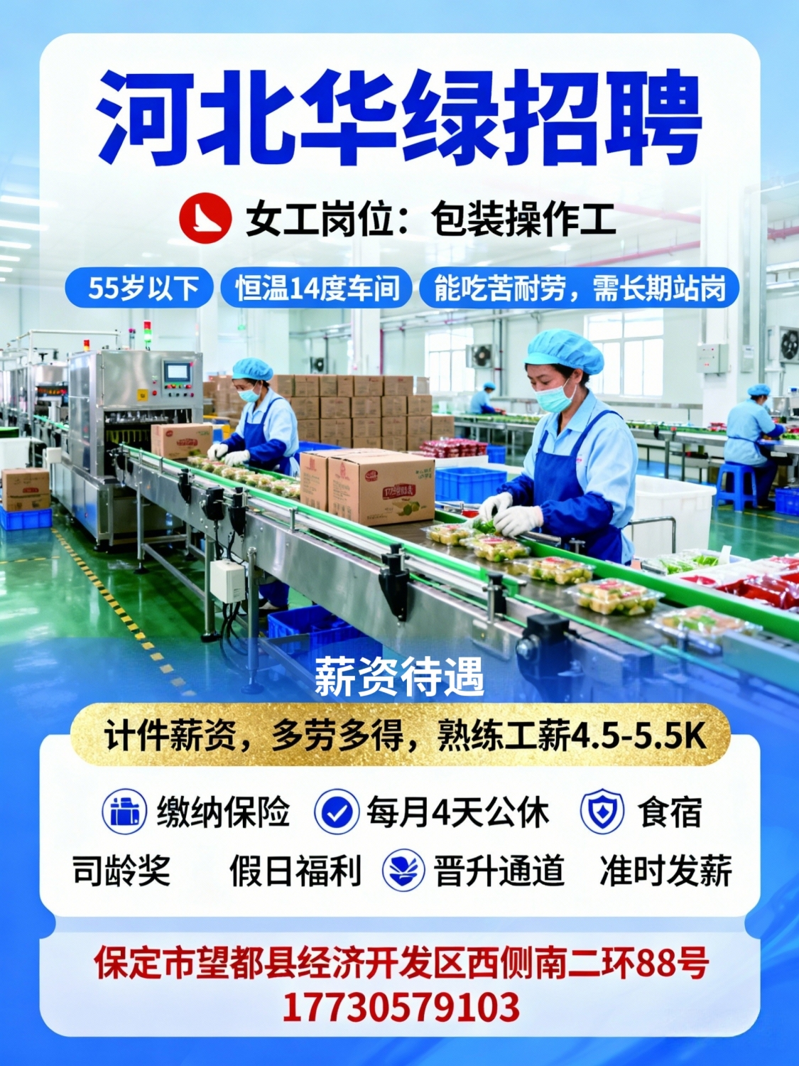 河北华绿现招聘信息女工岗位,包装操作工55岁以下,恒温14度车间,能吃苦耐劳,需长期站岗计件薪资,多劳多得,熟练工薪资4.5-5.5K福利待遇:缴纳保险,免费提供每月4天公休,食宿,司龄奖,假日福利,多元的晋升通道,准时发放工资。公司地址:保定市望都县经济开发区西侧南二环88号(固店镇井泉村东107国道南侧)联系电话:*****9103