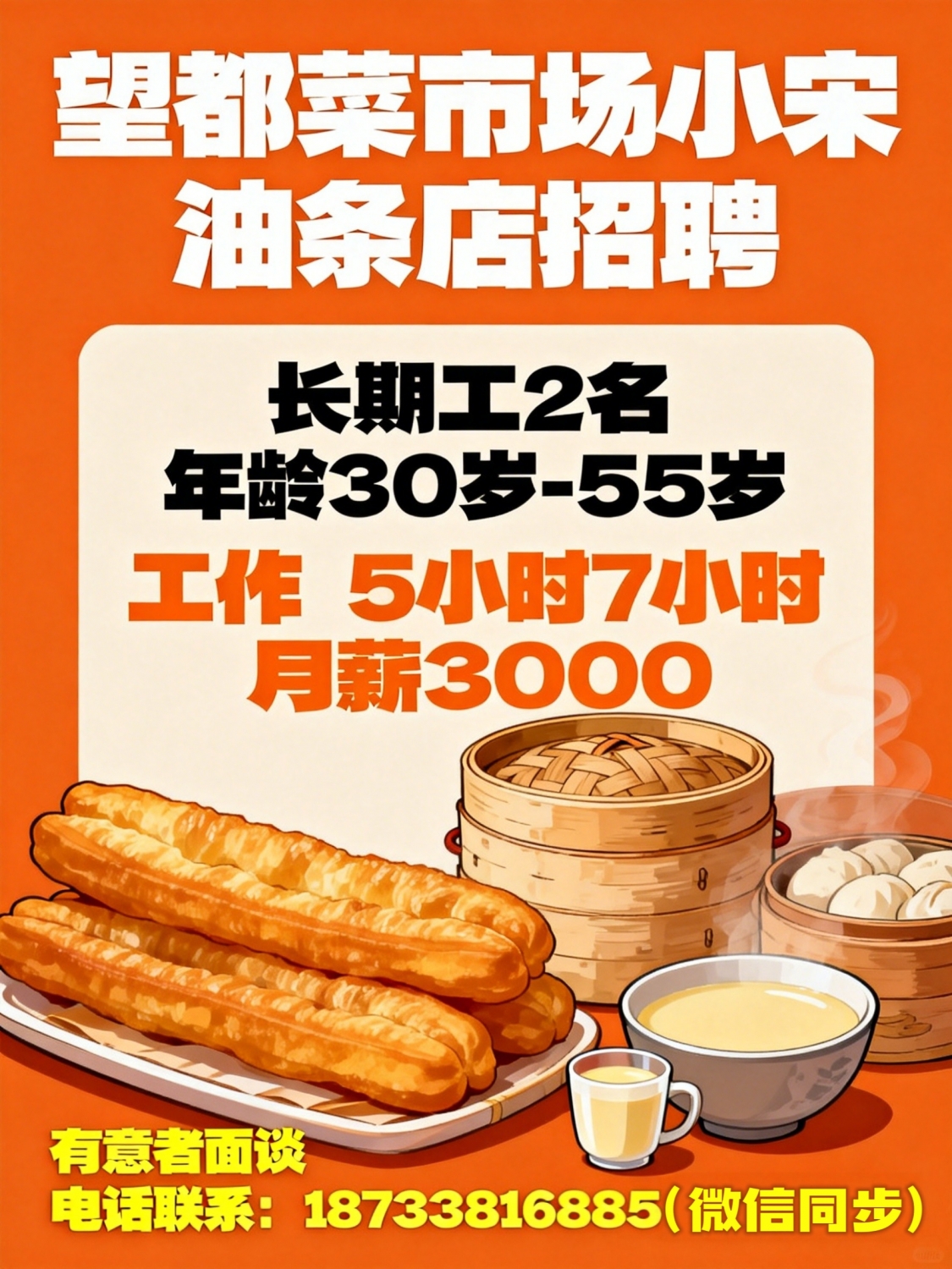 望都菜市场小宋油条店招聘长期工2名年龄30岁-55岁工作5小时7小时月薪3000,...