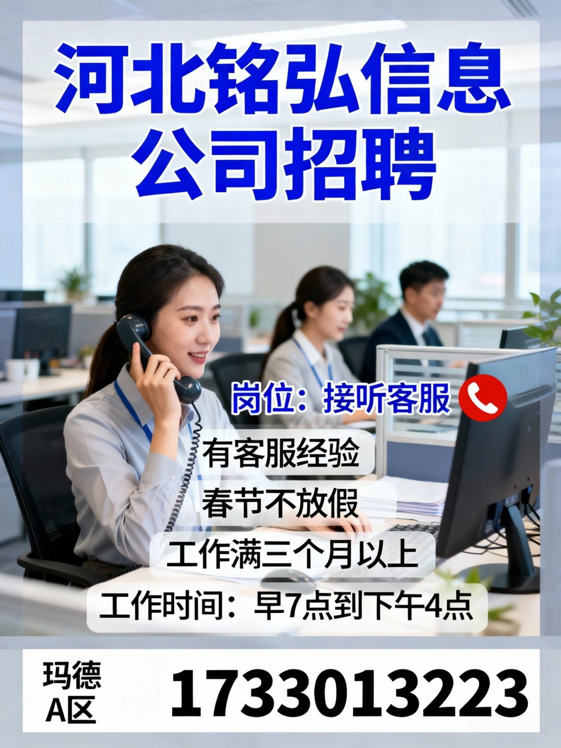 河北铭弘信息公司招聘接听客服任职要求:有客服经验,春节不放假,工作满三...