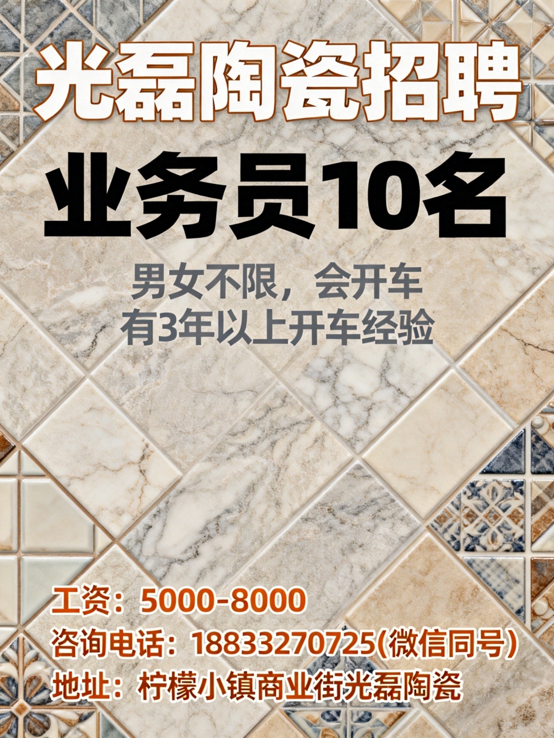 柠檬小镇商业街光磊陶瓷招聘业务员10名男女不限,会开车,有3年以上开车经...