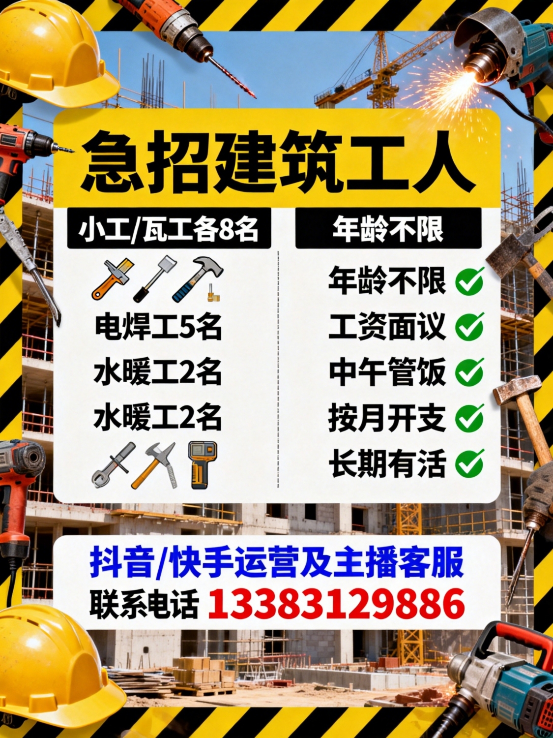 招聘小工,瓦工各8名电焊工5名水暖工2名年龄不限工资面议,中午管饭,按月开支长期有活抖音 快手运营,主播客服人员工资面议联系:*****9886