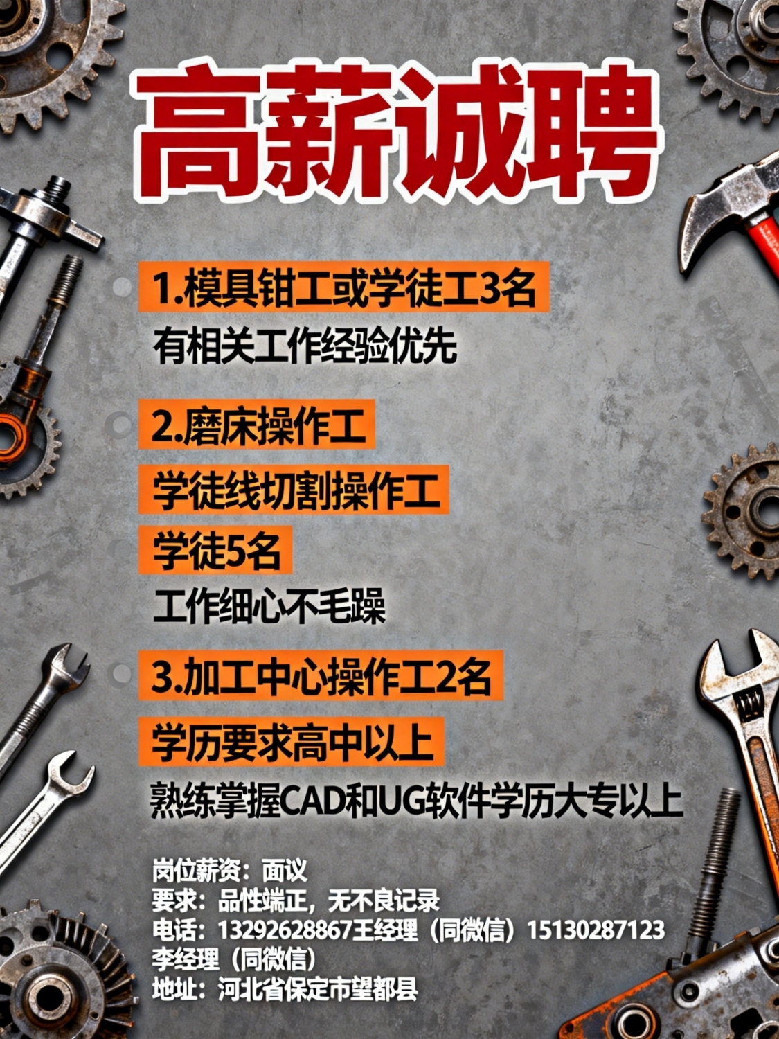 高薪诚聘1.模具钳工或学徒工3名,有相关工作经验优先2.磨床操作工或学徒线切...