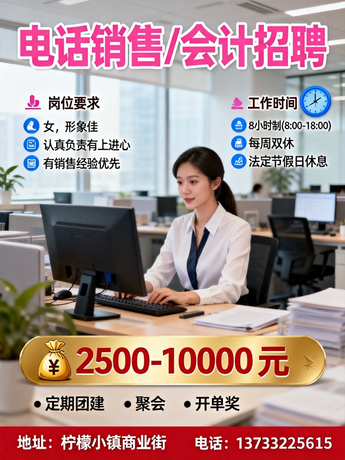 招聘电话销售,会计岗位要求女,形象佳,对工作认真负责有上进心,有销售经验的优先考虑。薪资待遇:时间:8小时,早8:00-晚18:00薪资待遇:2500-10000元,定期团建,聚会,开单奖,每周双休,节假日根据法定节假日休联系:*****5615地址:柠檬小镇商业街