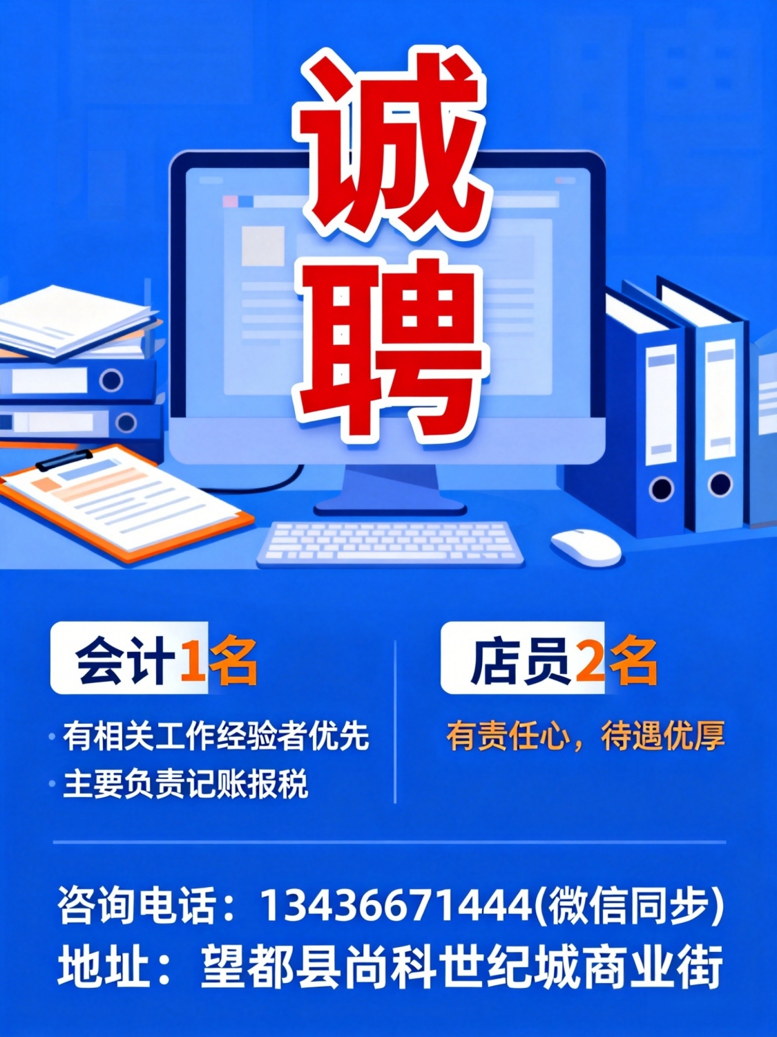 诚聘:会计1名有相关工作经验者优先,主要负责记账报税店员2名有责任心,待...