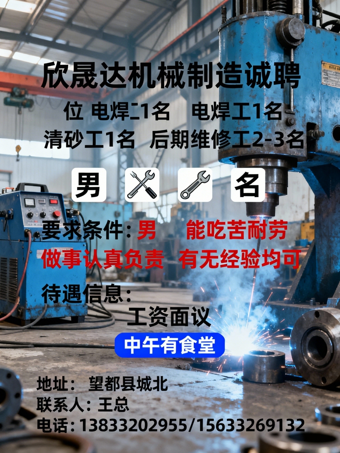望都县欣晟达机械制造有限公司因扩大生产现诚聘电焊工1名清砂工1名后期维修...