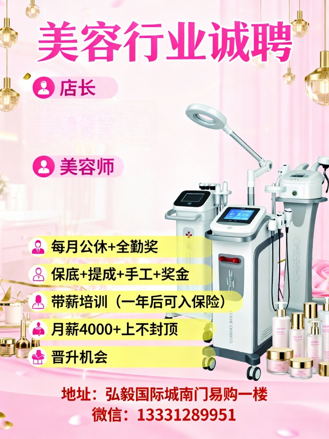 招聘 店长美容师售货员学员每月有公休,全勤奖,保底+提成+手工+奖金带薪培训,(一年后可入保险)月薪4000+尚不封顶,有机会提升店长微信:*****9951地址:弘毅国际城南门 易购一楼