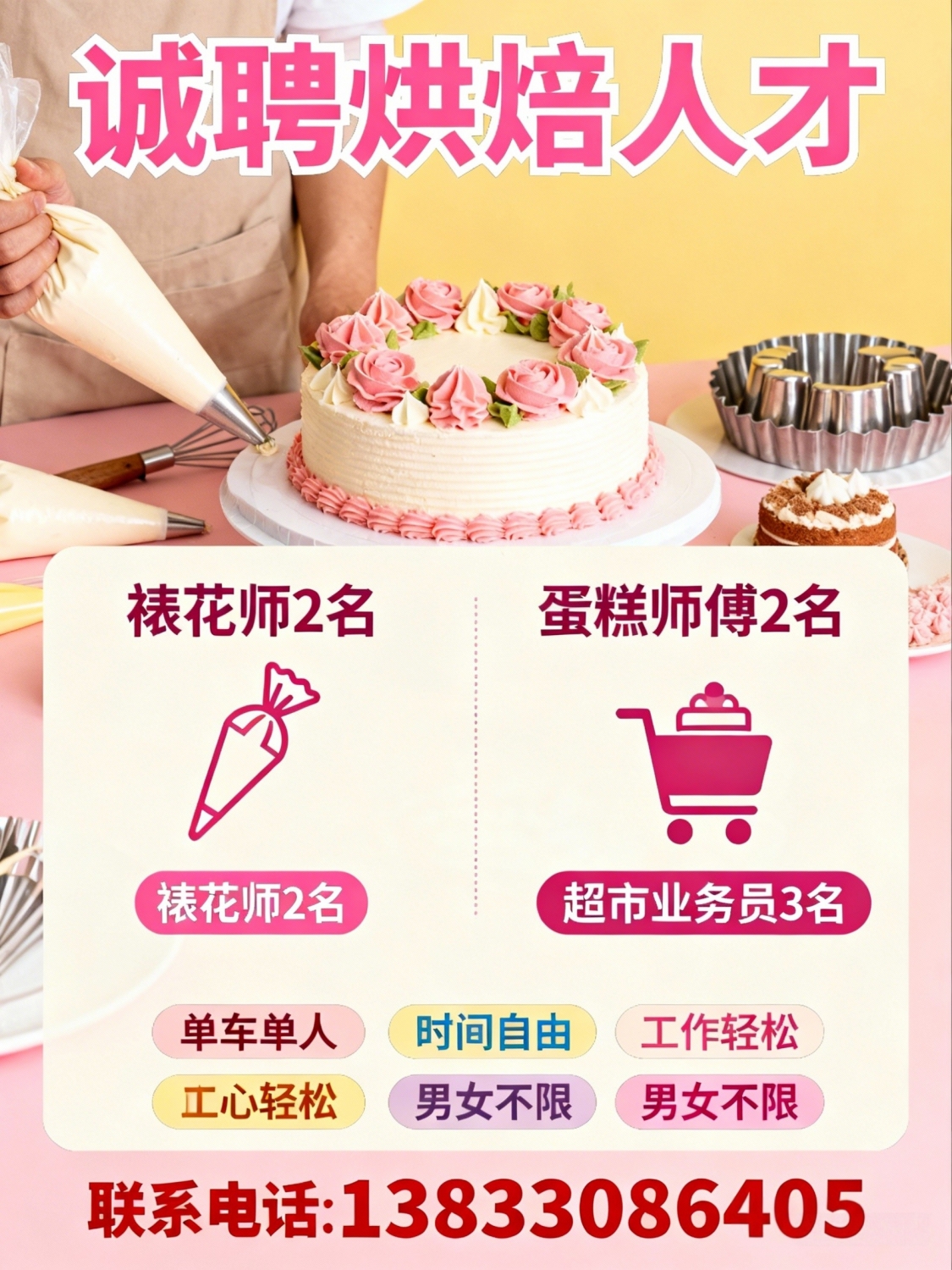 诚聘英才裱花师2名蛋糕师傅2名超市业务员3名单车单人,时间自由工作轻松,...