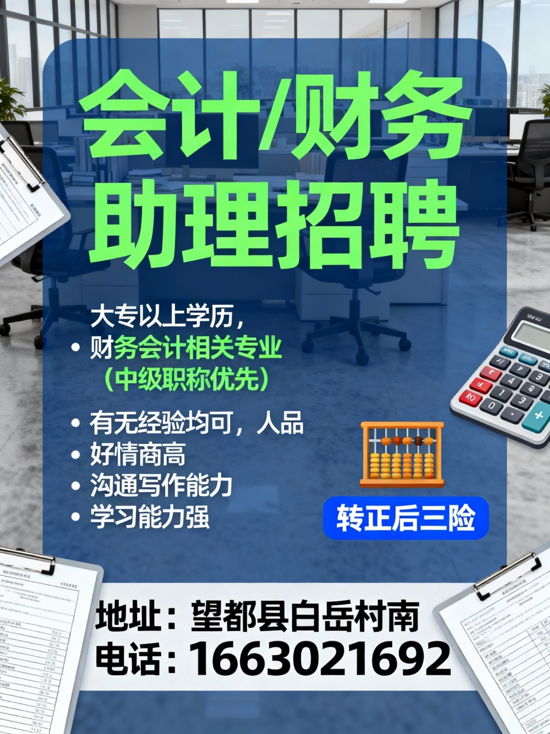招聘会计1名财务助理1名岗位要求1.大专以上学历,财务,会计相关专业(中级职称优先)2.有无财务工作经验均可,工作有人教,但人品必须好,情商高,具备一定的沟通能力及写作能力。3.具备较强的学习能力,职业素质能力强,能适应不断变化的政策环境4.转正后三险联系:*****1692地址:望都县白岳村南