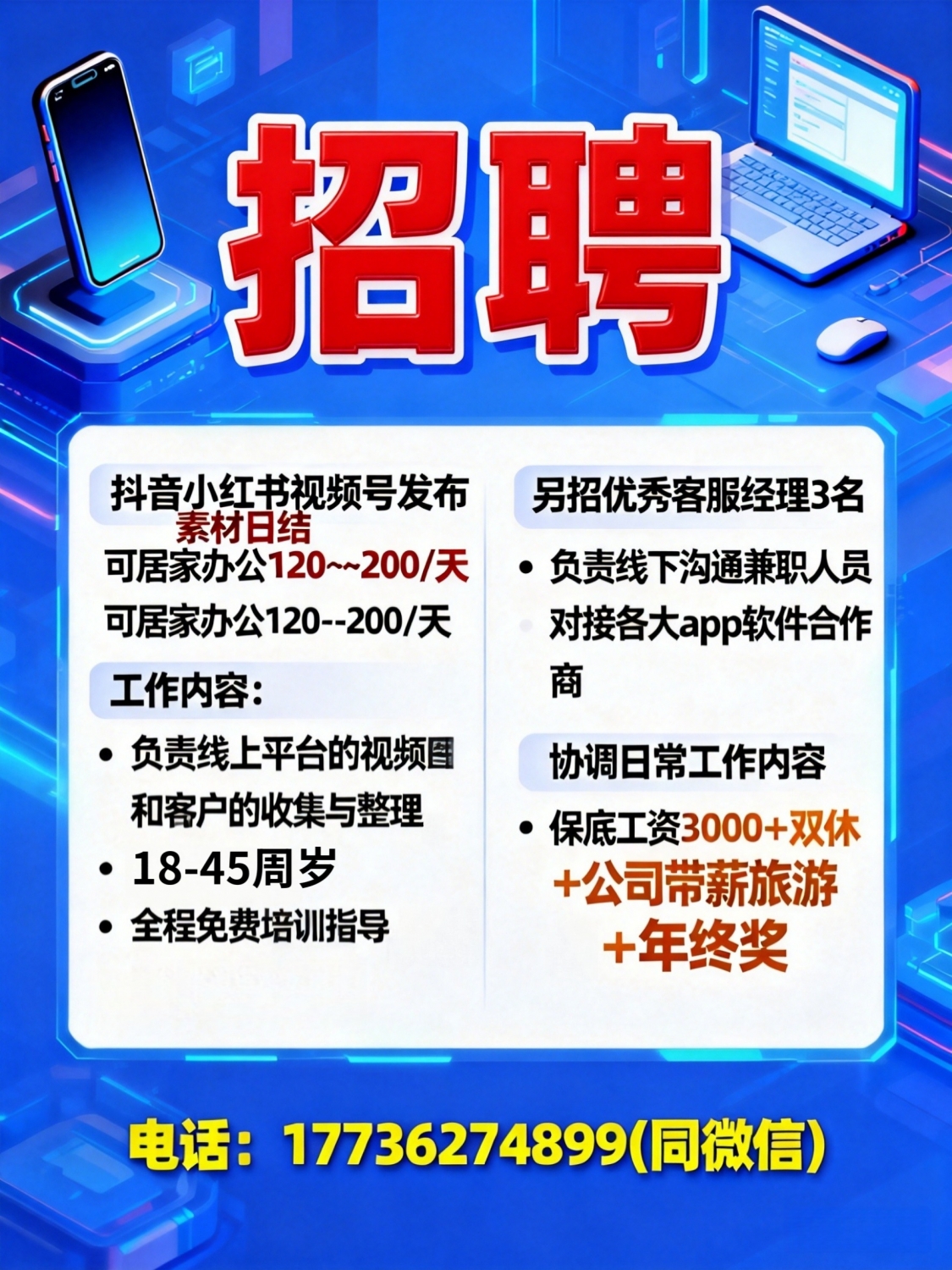 招聘:抖音小红书视频号发布素材日结 可居家办公120--200/天工作内容:负责...