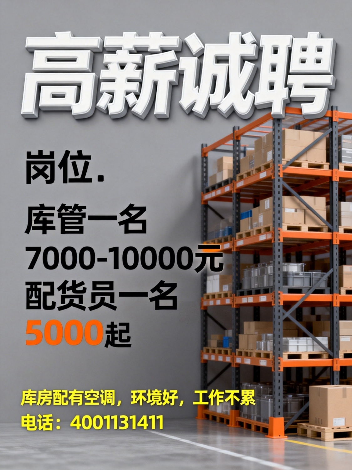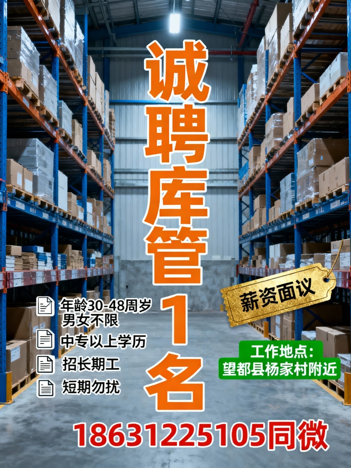 诚库管1名要求:年龄30-48周岁,男女不限中专以上学历(招长期工,短期勿扰)薪资面议工作地点:望都县杨家村附近电话:*****5105同微