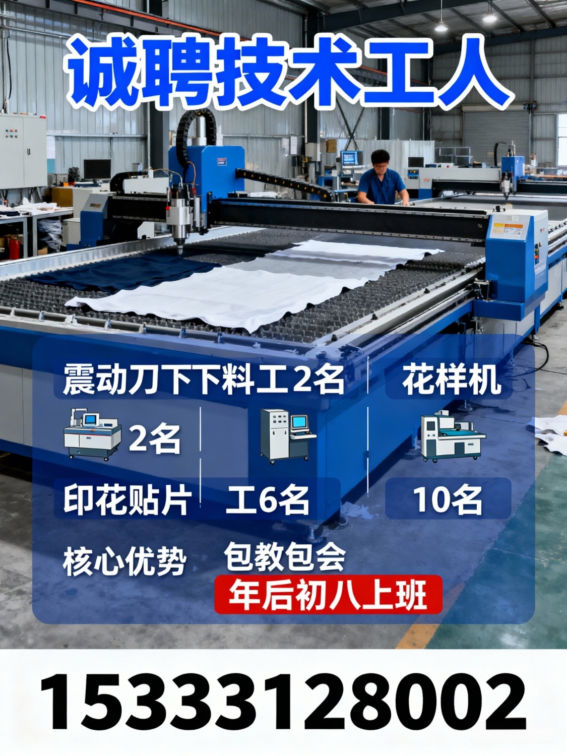 招聘震动刀下料工2名印花贴片工6名花样机10名包教包会,年后初八上班电话:...