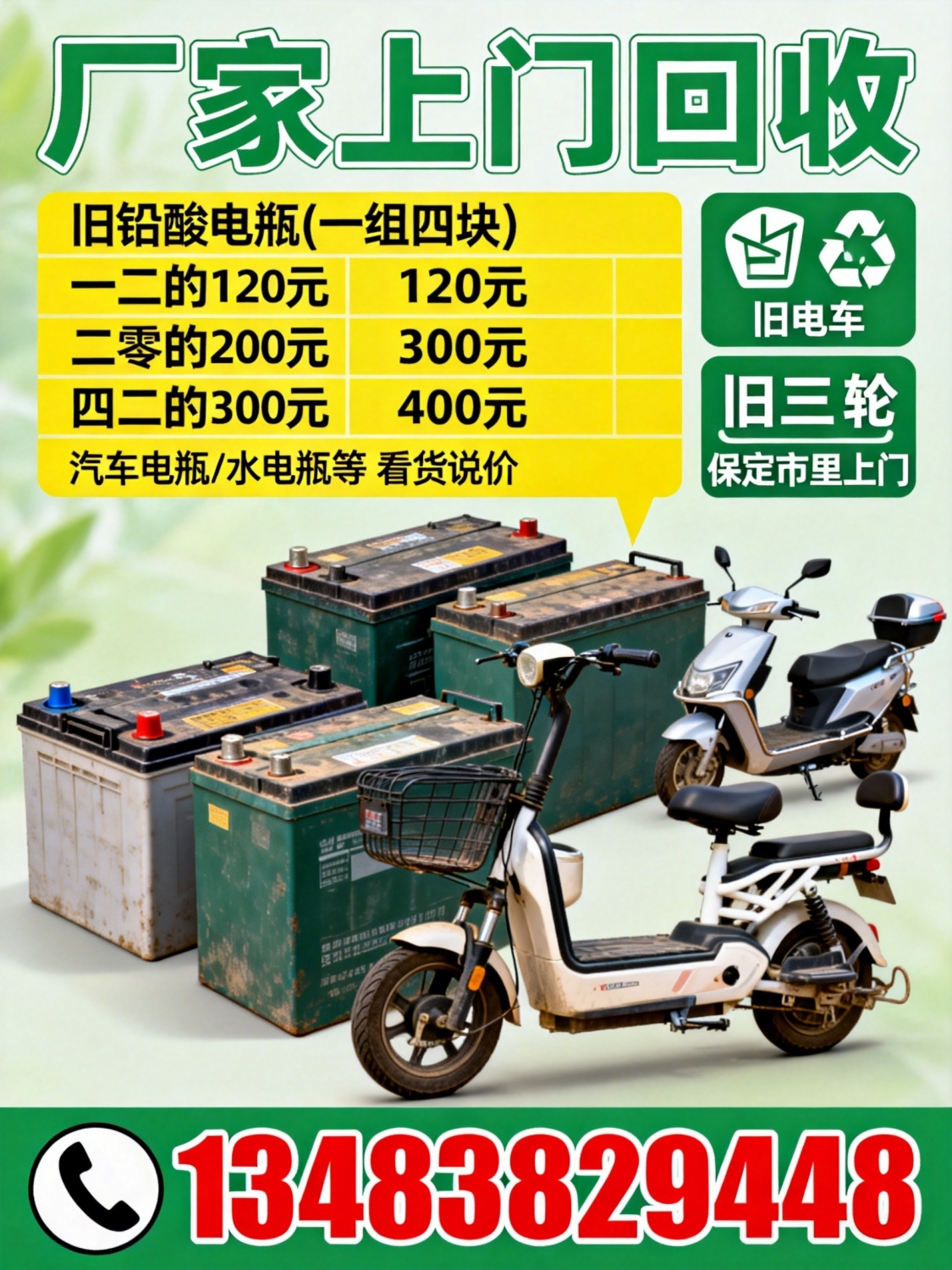 厂家回收:旧铅酸电瓶一组四块的价格一二的120 二零的200三二的300 四五的400汽车电瓶水电瓶等各种电瓶看货说价旧电车,旧三轮儿都收保定市里上门回收电话:*****9448