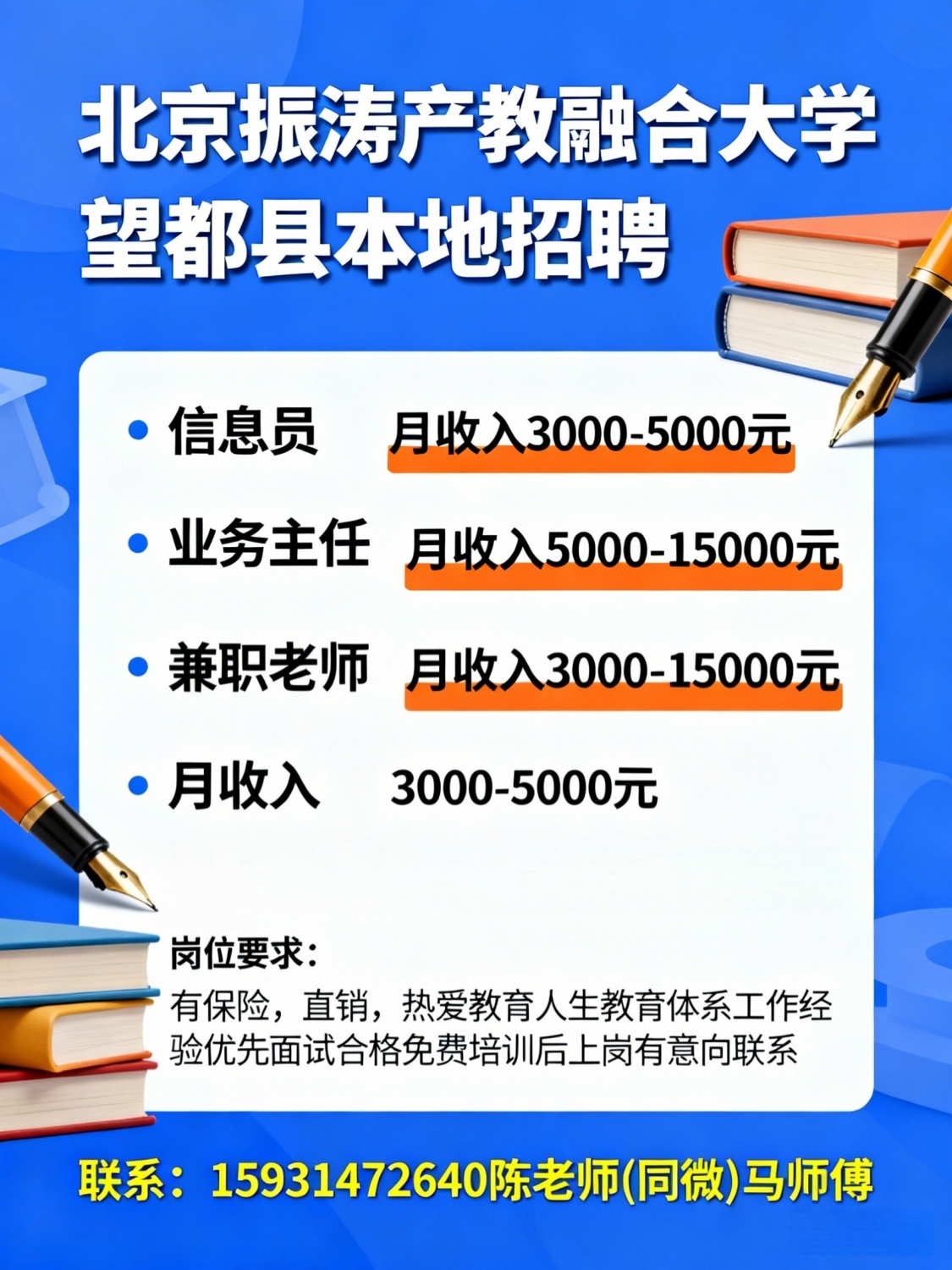 北京振涛产教融合大学望都县本地招聘信息员,月收入3000-5000元 业务主任,...