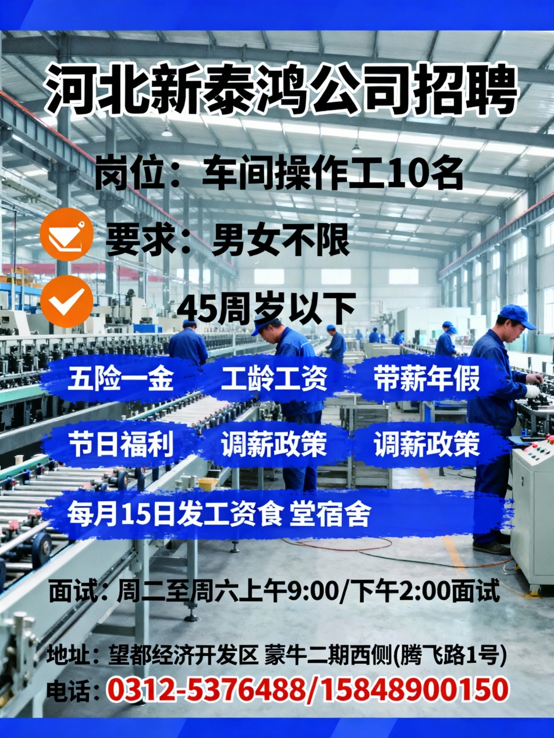 河北新泰鸿公司招聘车间操作工:10名男女不限,要求45周岁以下福利待遇:五...