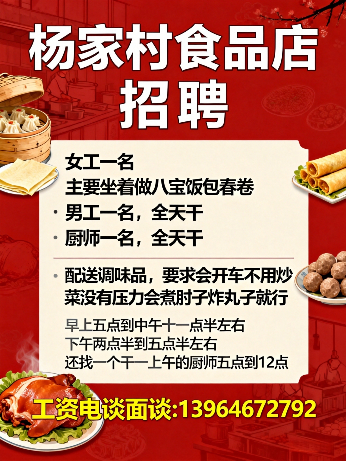 食品店招聘女工一名主要坐着做八宝饭包春卷男工一名,全天干厨师一名,全天...