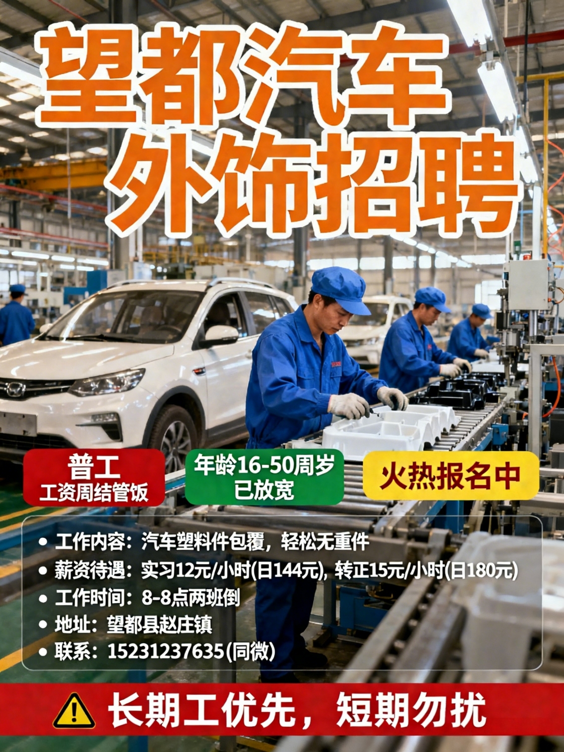 望都汽车内外饰招聘普工工资周结管饭年龄已放宽 快来咨询 火热报名中招长期工,短期勿扰工作内容:汽车塑料件包覆,轻松无重件工作要求:16-50周岁,男女均可薪资待遇:实习期半个月12/小时,日工资144元转正后15/小时,日工资180元工作时间:8-8点 两班倒工作地址:望都县赵庄镇有意联系:*****7635(同微)