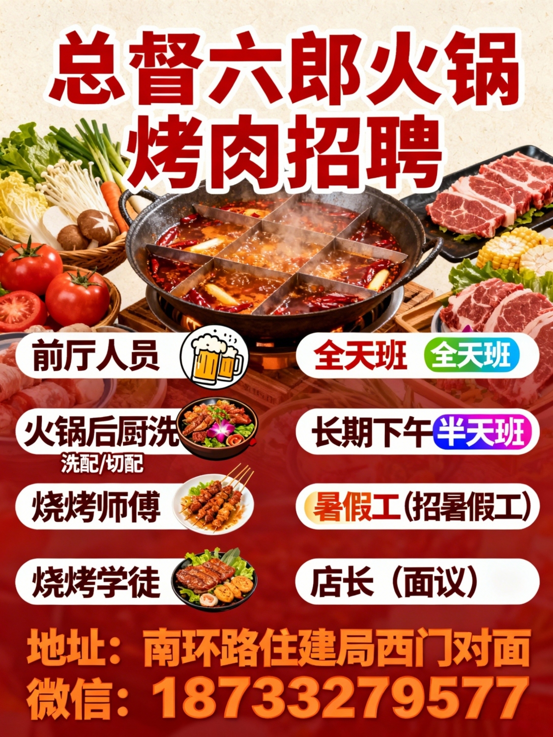 总督六郎火锅烤肉招聘全天班,长期下午半天班和暑假工1.前厅人员2.火锅后厨...