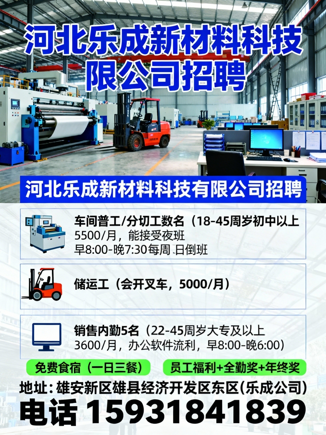 河北乐成新材料科技有限公司招聘:车间普工,分切工(数名)要求:年龄18-45...