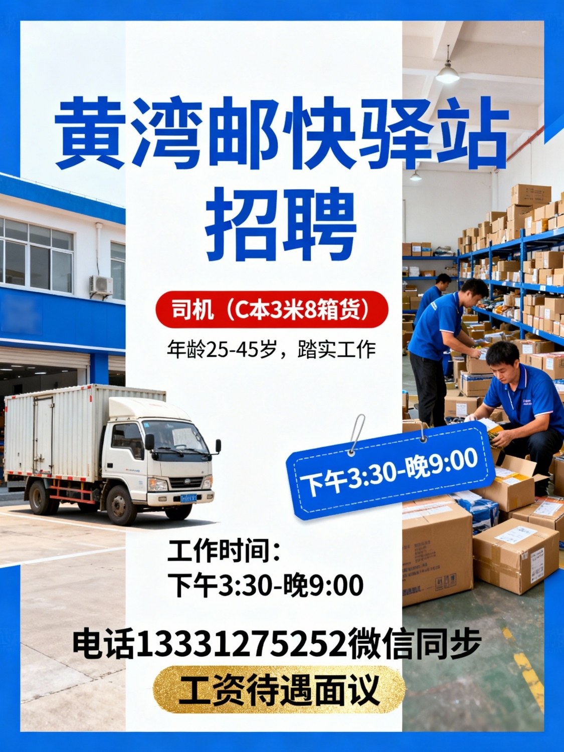 黄湾邮快驿站招司机,C本3米8箱货,年龄25-45岁踏实工作,下午3:30-晚9:00...