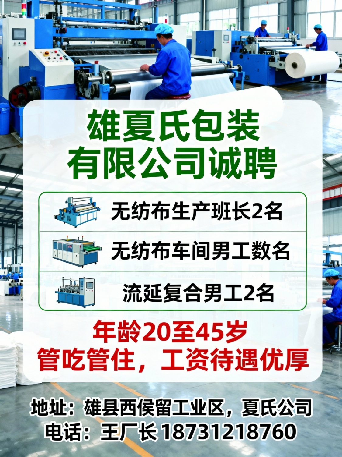 雄夏氏包装有限公司诚聘:无纺布生产班长2名年龄20至45岁,管吃管住,工资待遇优厚无纺布车间男工]数名年龄20至45岁,管吃管住,工资待遇优厚流延复合男工2名年龄20至45岁,管吃管住,工资待遇优厚联系电话:王厂长 *****8760公司地址:雄县西侯留工业区 夏氏公司