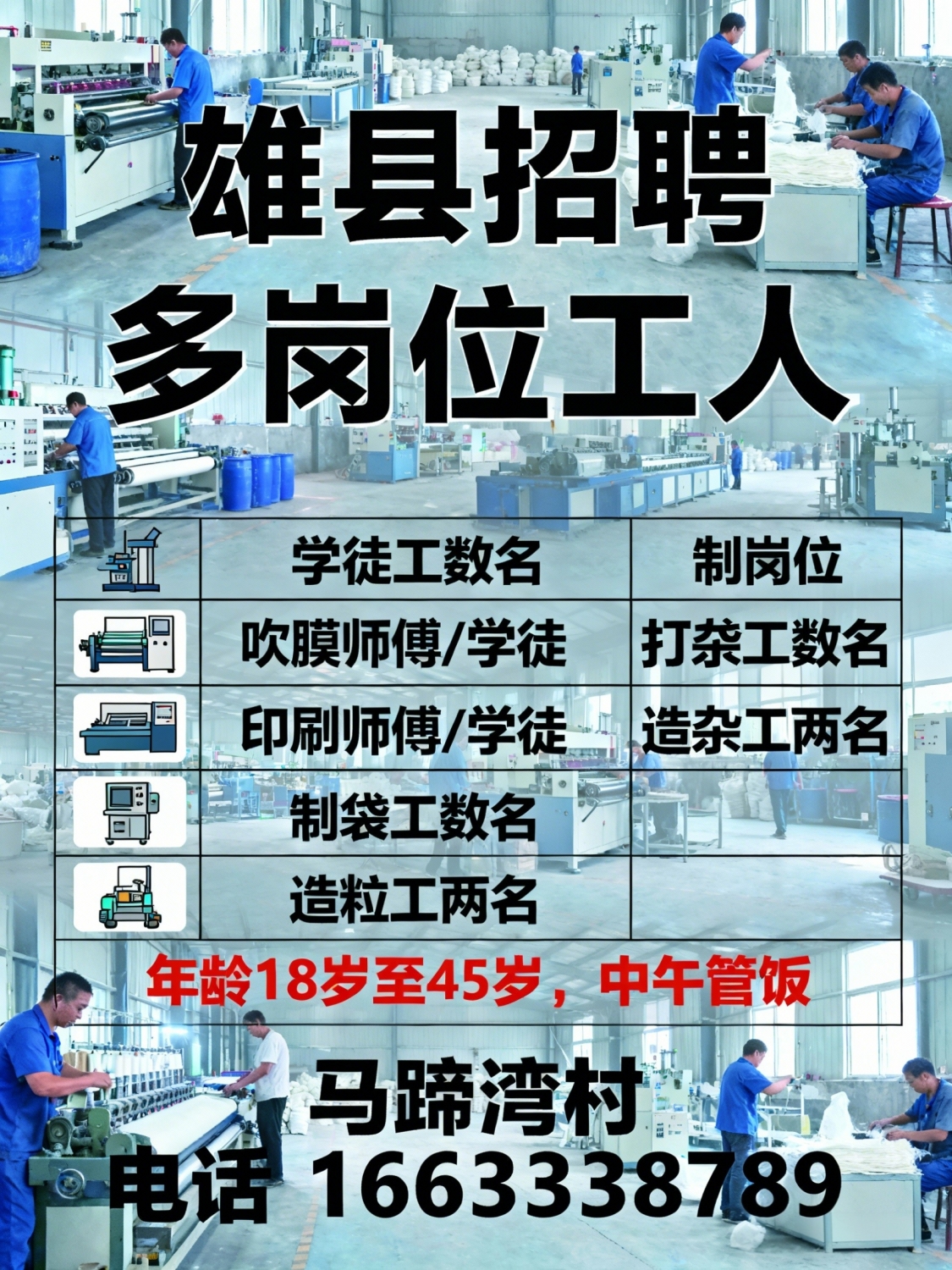 雄县招聘:学徒工数名吹膜师傅,学徒印刷师傅,学徒,制袋工数名学徒工数名...