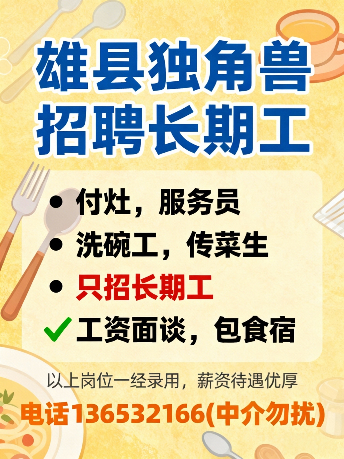 雄县独角兽招聘长期工:付灶,服务员,洗碗工,传菜生(只招长期工)工资面谈,包食宿。以上岗位一经录用,薪资待遇优厚电话:*****2166(中介勿扰)