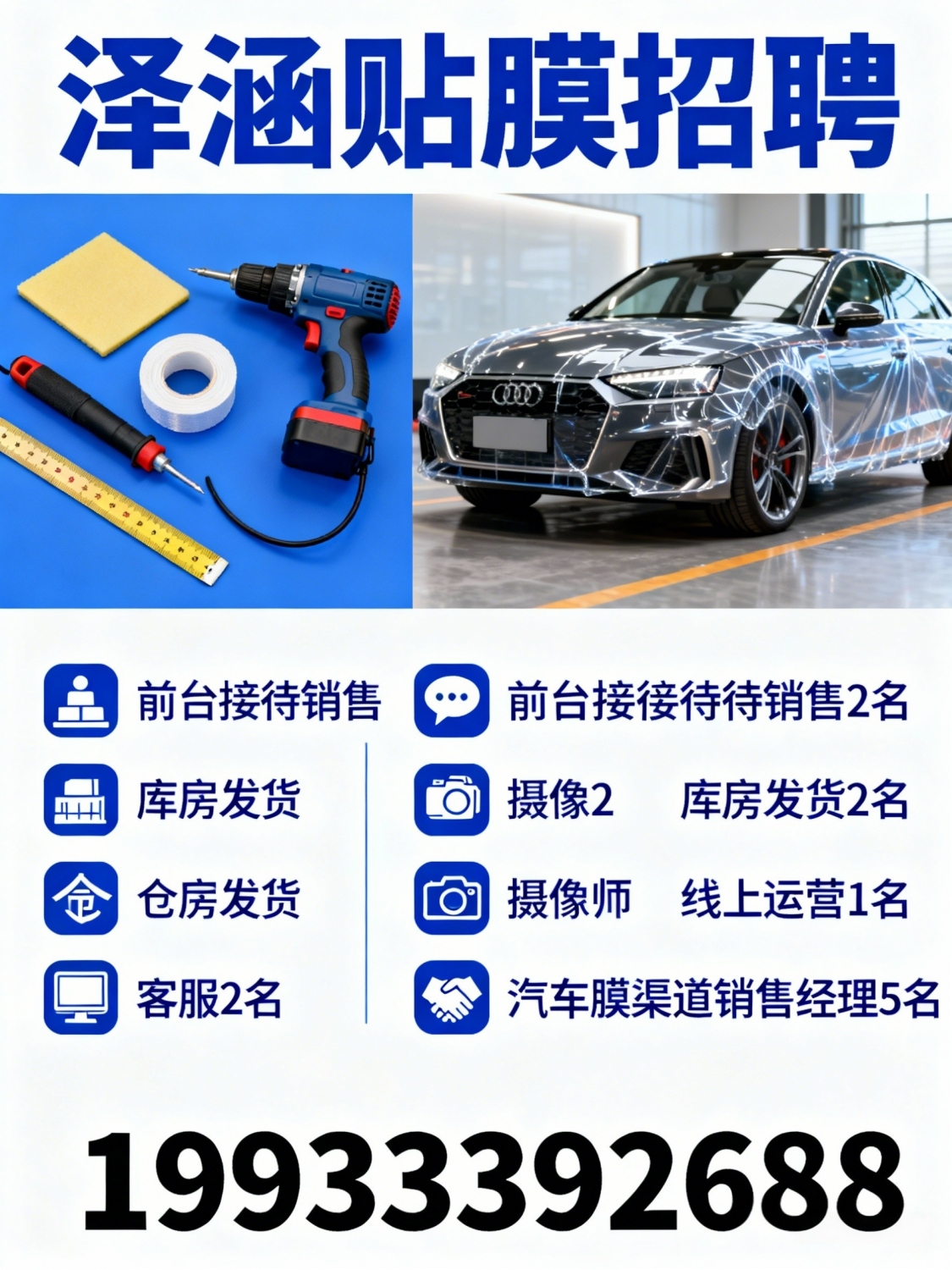 泽涵贴膜招聘:前台接待销售2名库房发货2名客服2名摄像师2名线上运营1名汽...