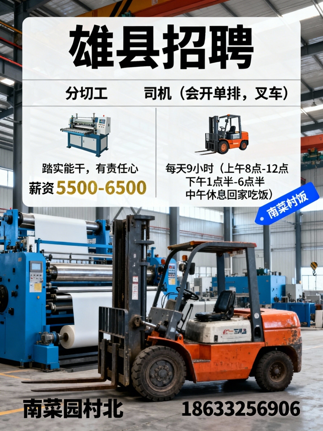 雄县招聘分切工,司机(会开单排,叉车)踏实能干,有责任心,工资5500-6500...