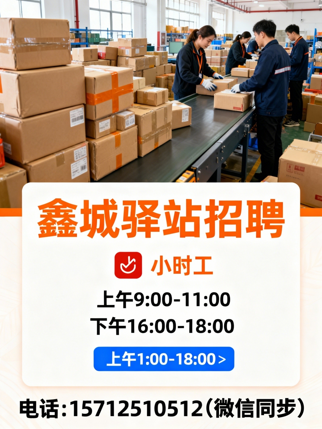鑫城驿站招聘小时工,上午9:00-- -11:00,下午16:00-18:00联系电话:157125...