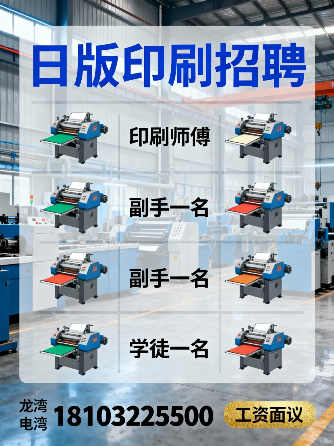 招聘曰版印刷师傅一名副手一名学徒一名,工资面议地址:龙湾联系电话:1810...