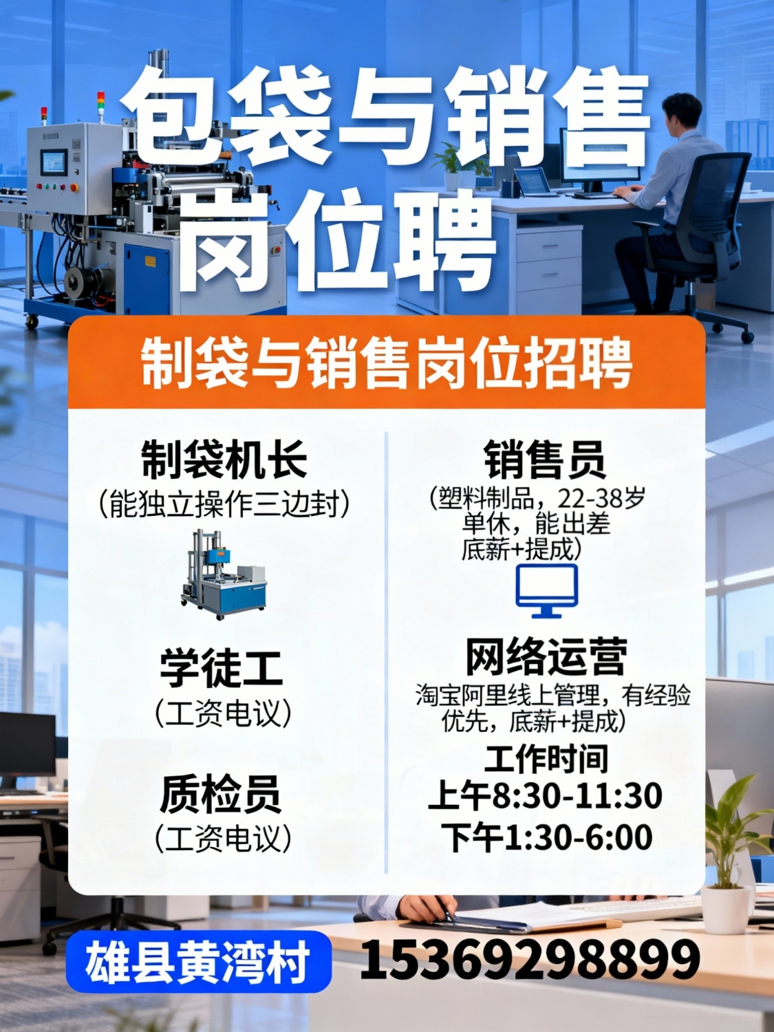 招聘:制袋机长(能独立操作三边封)学徒工,质检员工资电议销售员(塑料制品)...