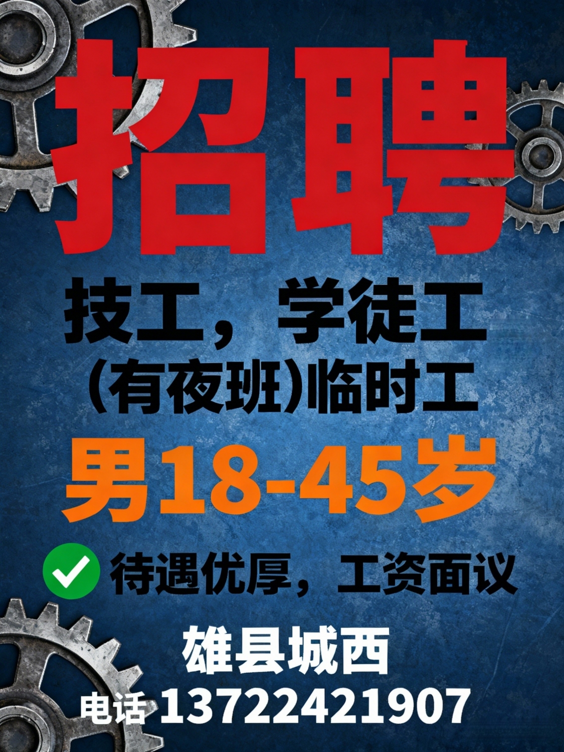 招聘技工,学徒工,(有夜班)临时工要求:男18-45岁,待遇优厚,工资面议地...