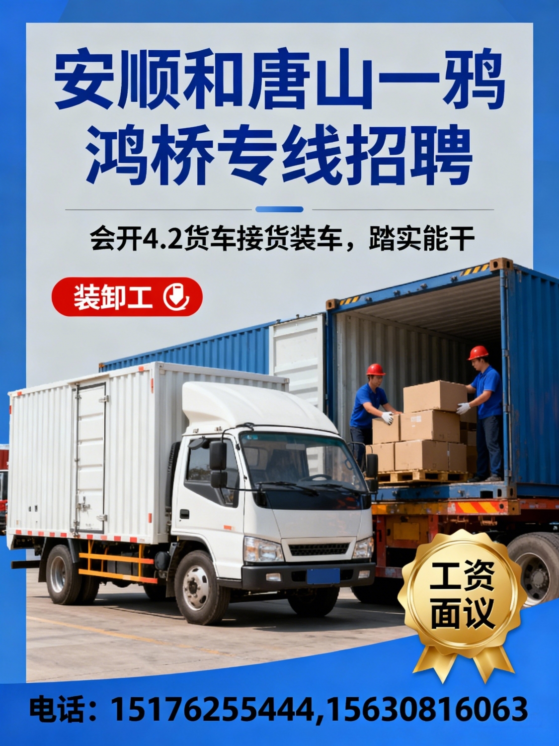 安顺和唐山一鸦鸿桥专线招装卸工要求会开4.2货车接货装车,踏实能干,工资...