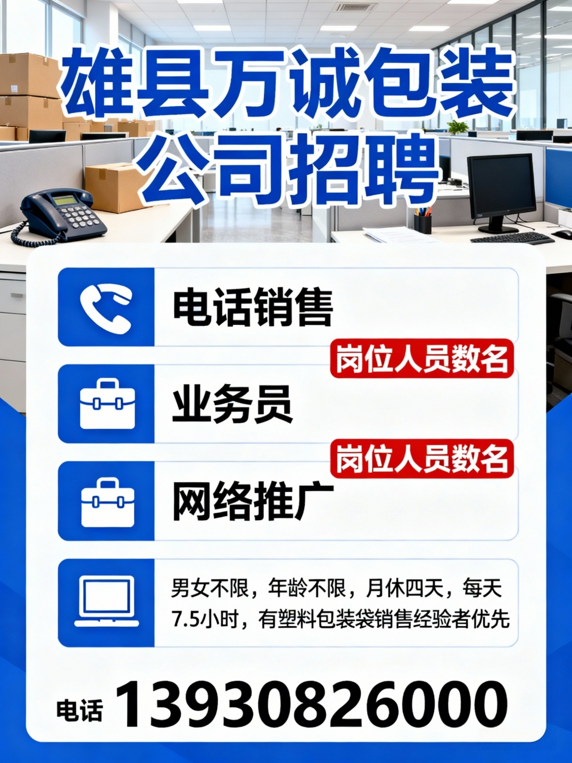 雄县万诚包装公司招聘电话销售业务员网络推广岗位人员数名。男女不限,年龄不限,月休四天,每天7.5小时有塑料包装袋销售经验者优先电话:*****6000