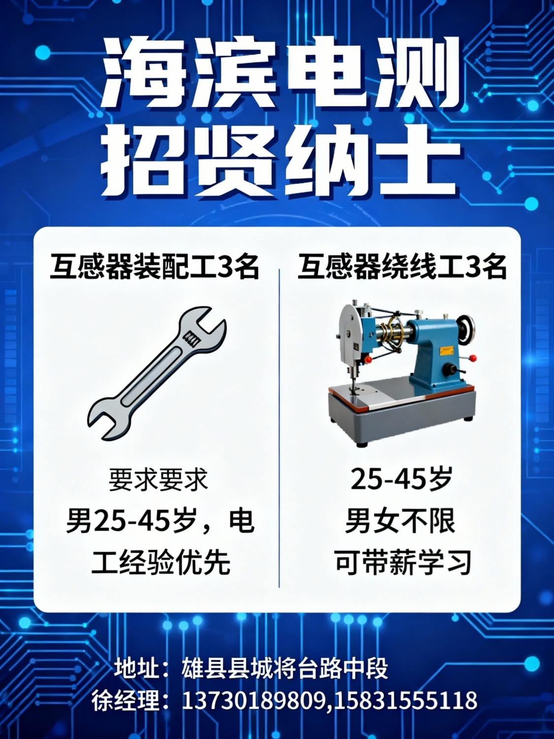 海滨电测招贤纳士:互感器装配工3名岗位要求:负责互感器装配工作要求男士...