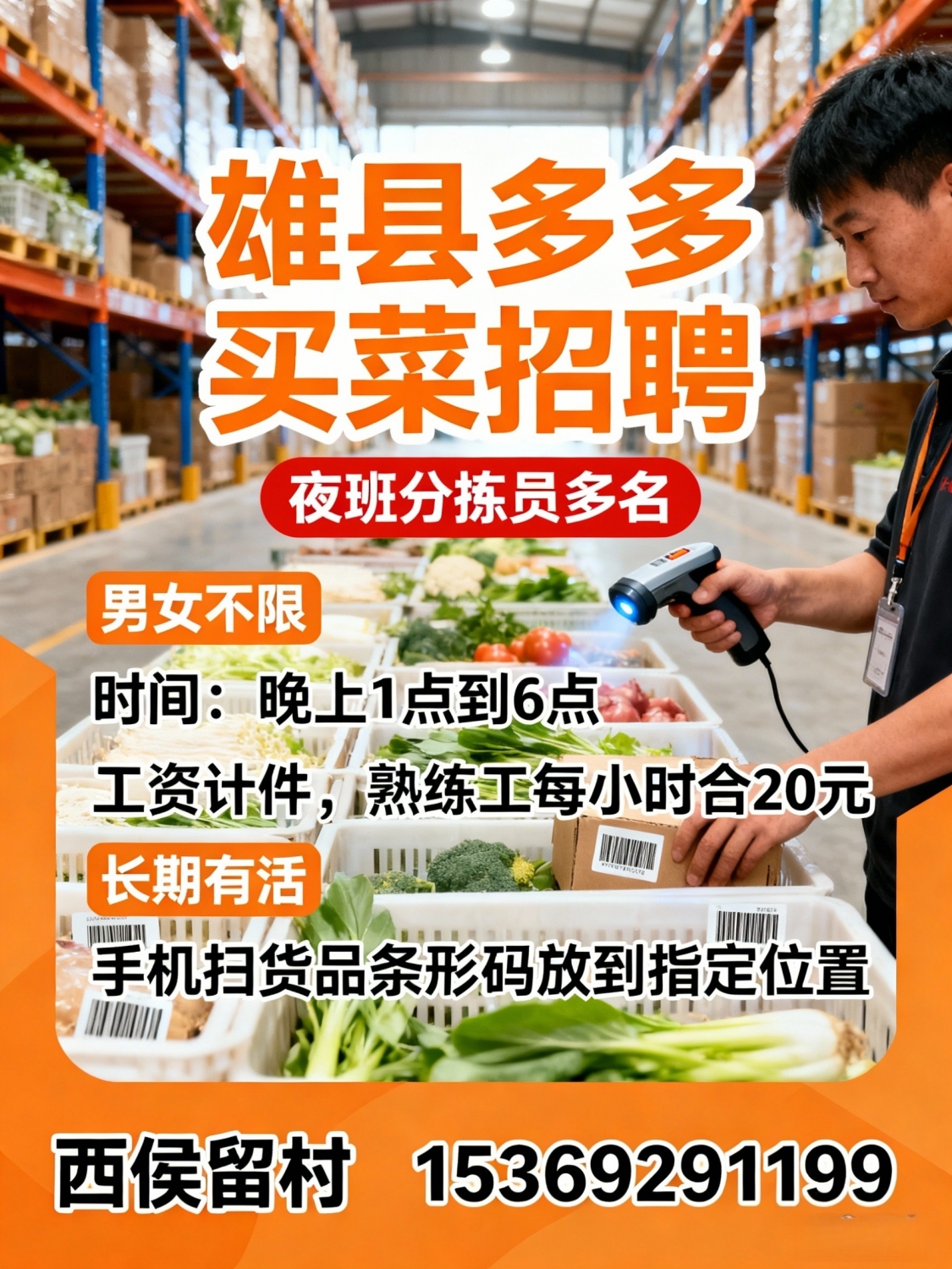 雄县多多买菜招聘:夜班分拣员多名男女不限时间晚上1点到6点工资计件,熟练工每小时合20元长期有活手机扫货品条形码放到指定位置地址:西侯留村电话:*****1199