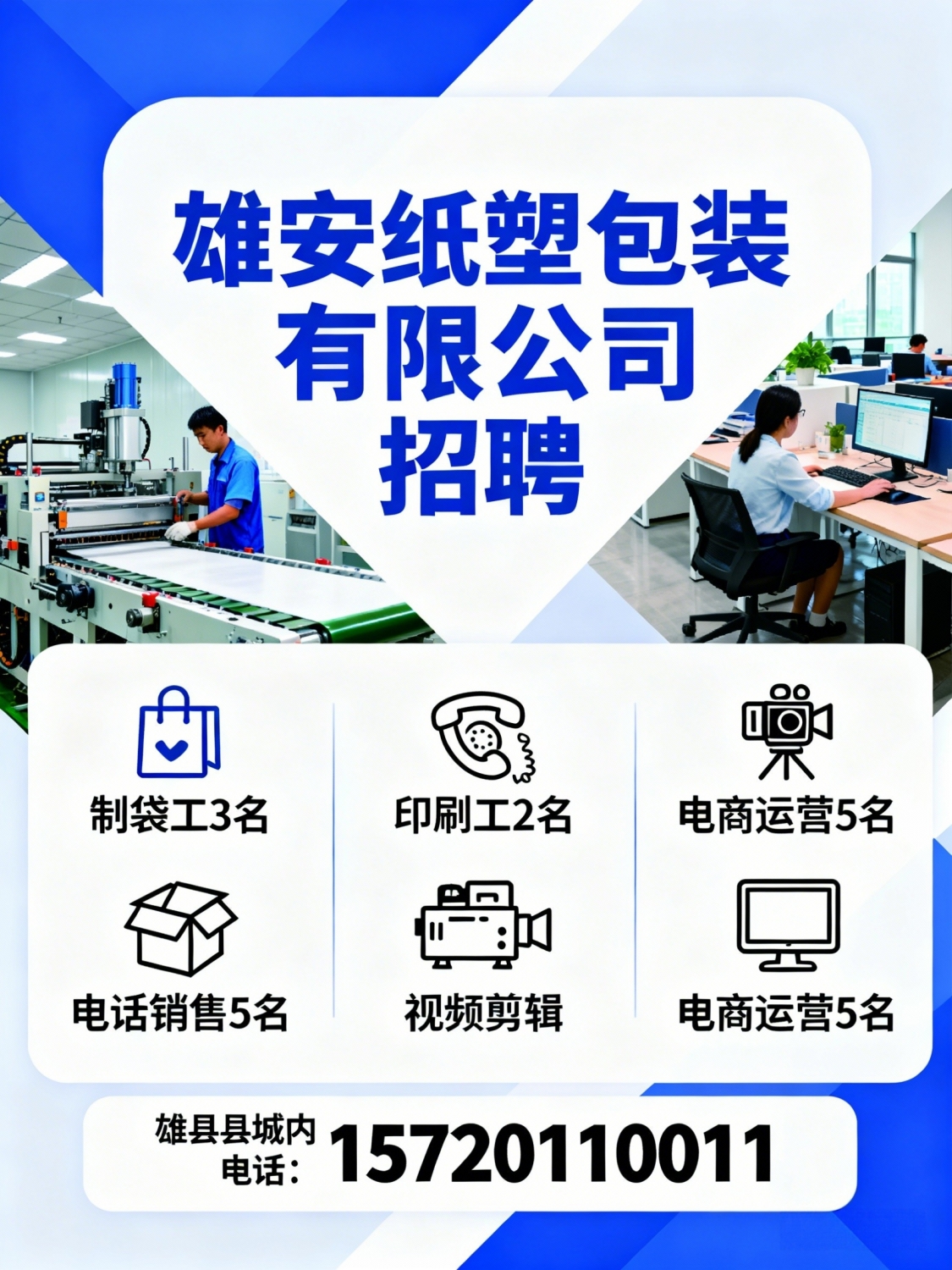 雄安纸塑包装有限公司招聘:制袋工3名电话销售5名印刷工2名视频剪辑,电商...