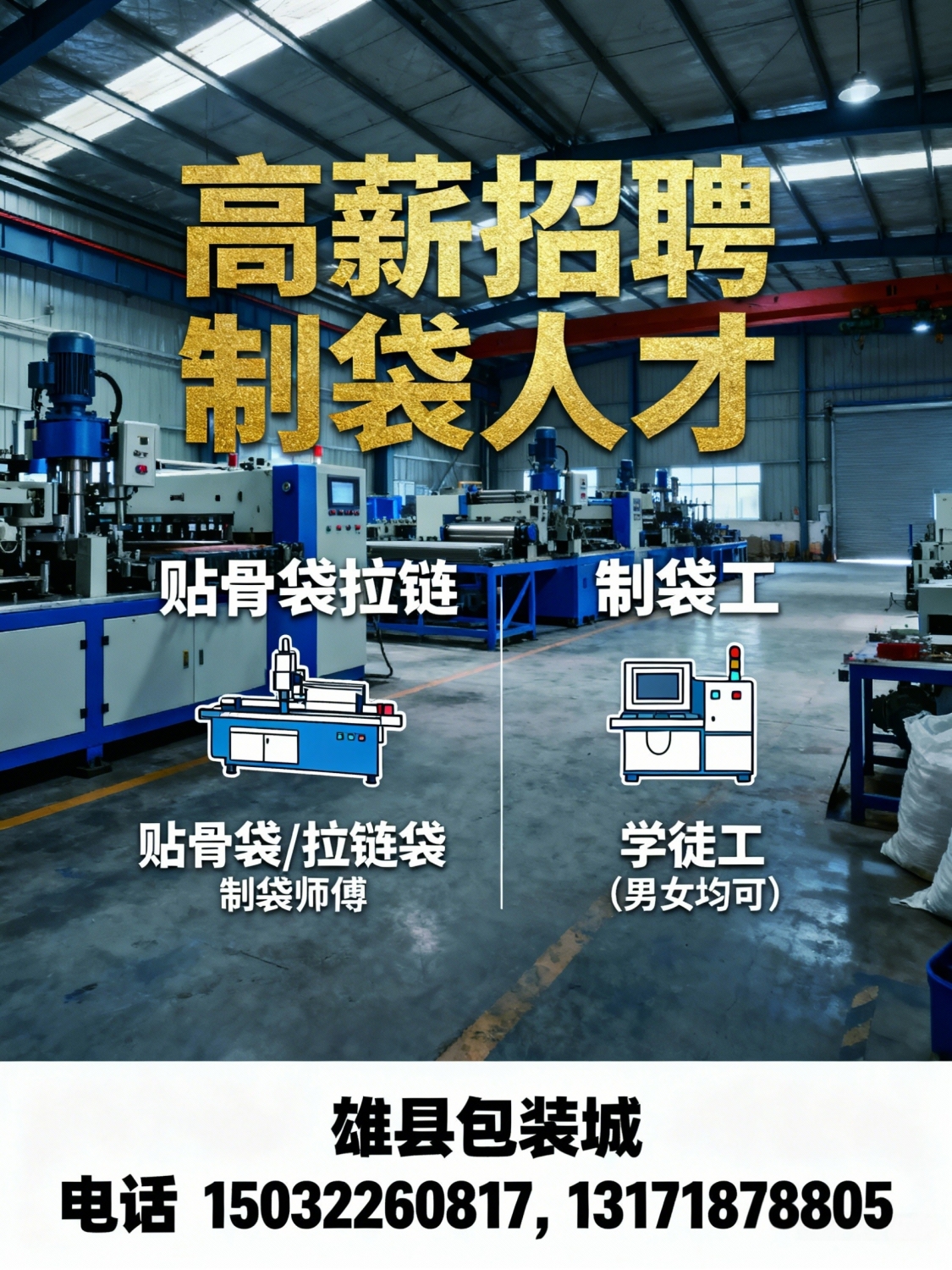 高薪招聘贴骨袋拉链袋制袋师傅制袋工学徒工男女均可地址:雄县包装城电话:...