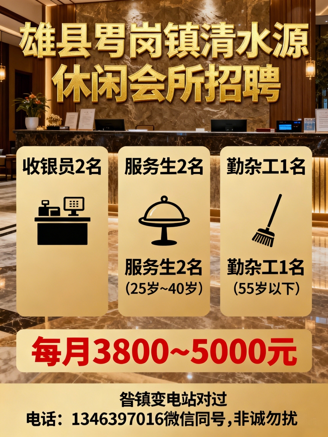 雄县昝岗镇清水源休闲会所招聘收银员二名服务生二名年龄25岁~40岁勤杂工一...