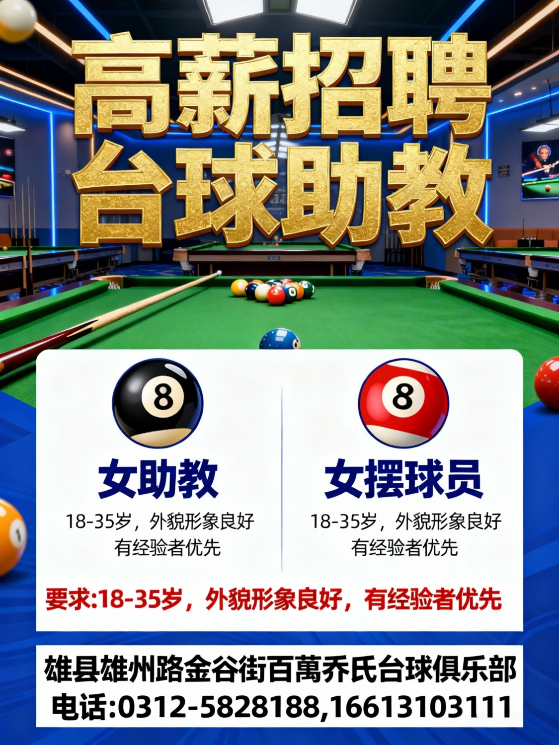 高薪招聘:女助教,女摆球员要求:18-35岁,外貌形象良好,有经验者优先电...