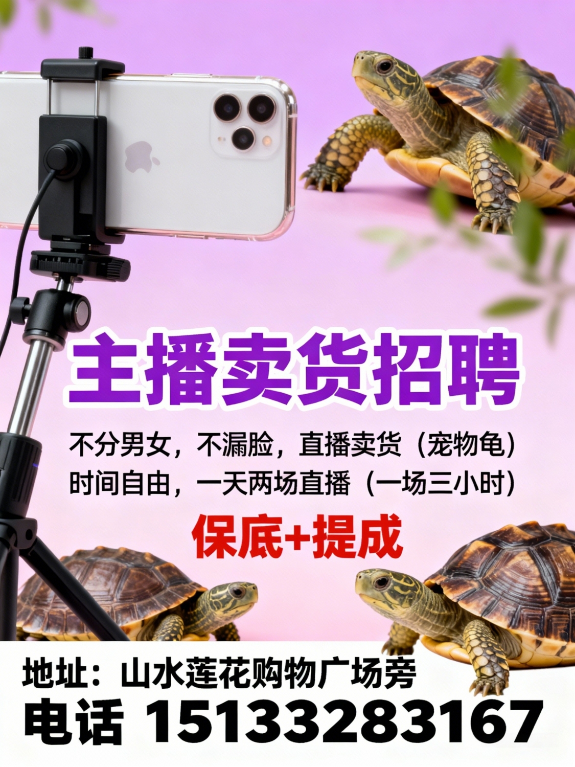 招聘主播,招主播卖货不分男女不漏脸,直播卖货。卖宠物龟时间自由,一天两...