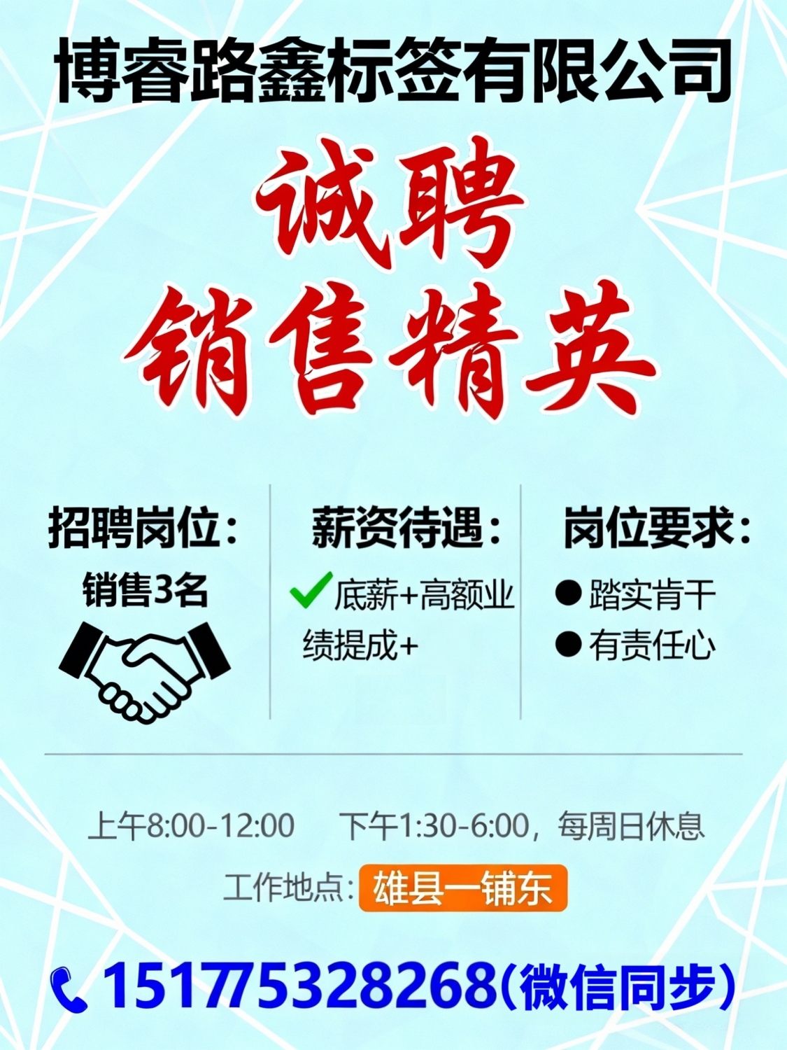博睿路鑫标签有限公司招聘销售3名薪资待遇:底薪+高额业绩提成+全勤要求:踏实肯干,有责任心工作时间:上午8:00-12:00下午1:30-6:00,每周日休息工作地点:雄县一铺东联系电话:*****8258(微信同步