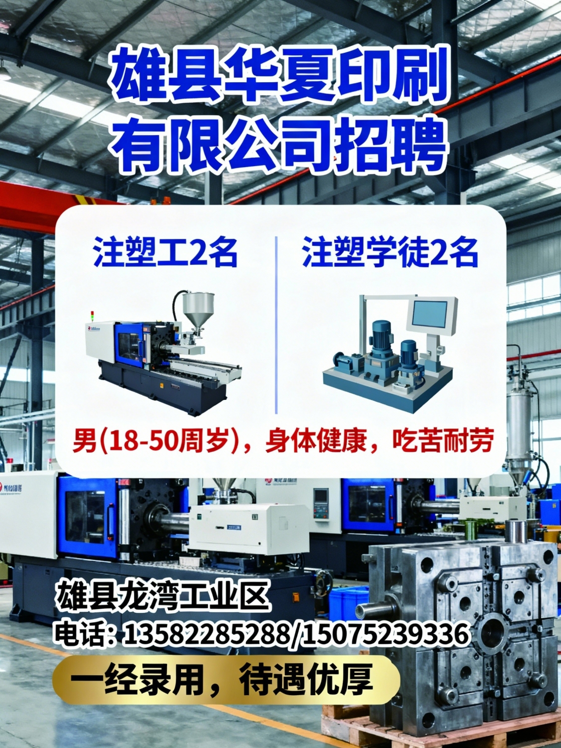 雄县华夏印刷有限公司招聘:注塑工2名注塑学徒2名要求:男(18-50周岁),身...