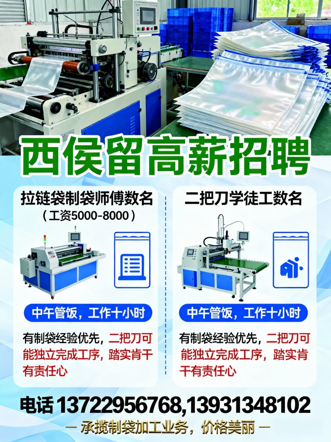 西侯留高薪招聘拉链袋制袋师傅数名,工资5000到8000二把刀学徒工数名,中午...